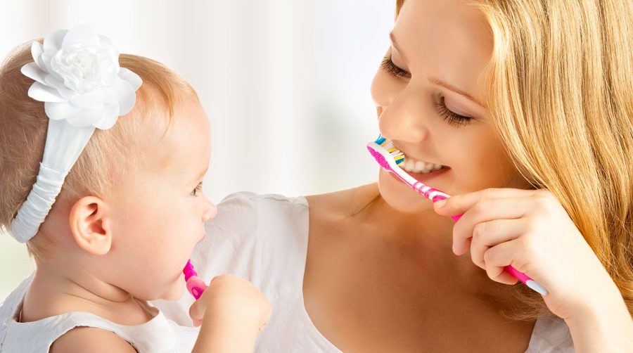 Los niños al principio piensan que su mamá y ellos son solo 1 como cuando estaban en la barriguita, es un buen momento para que nos vean cepillándonos los dientes y que les dejemos jugar con un estimulador de encías, por ejemplo, mientras que nosotros nos cepillamos. Les entrarán ganas más tarde de imitarnos.